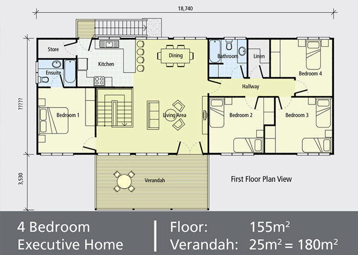 - Es gibt 155 m² Bodenfläche und 25 m² Veranden, insgesamt 180 m²