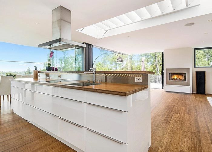 Diese Zone verfügt über große Fenster auf mehreren Seiten, wodurch ein helles und geräumiges Wohnzimmer entsteht, das sich aus allen Blickwinkeln mit der Natur verbunden anfühlt.